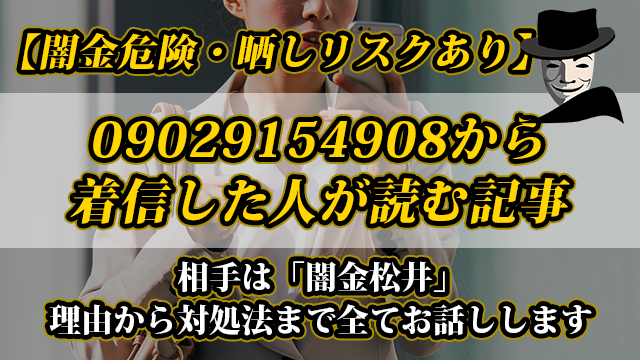 090-2915-4908からの着信は、非合法な手段を用いて個人情報を流出させ、それを元に電話勧誘を行う「闇金松井」からのものです。この業者に関わると犯罪被害に遭う危険性があるため、警戒が必要です。