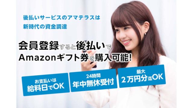 アマテラスが提供しているのは「Amazonギフトを後払いで購入できる」というサービスです。クレジットカードのショッピング枠が残っている人であれば、いつでも欲しい物を購入することができるでしょう。