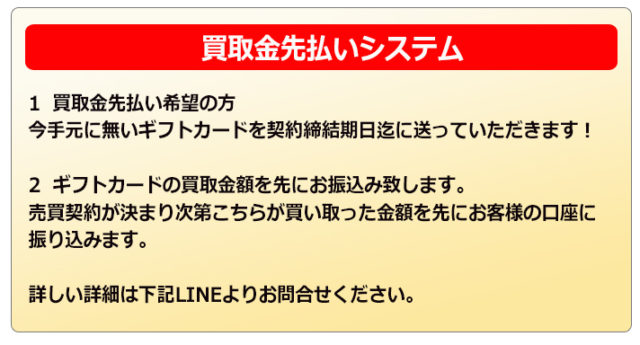 ギフトカード買取マンのサービスの特徴は、手元にギフトカードがなくても契約日までに発送することを条件にその場で買取額を振り込んでもらうことができるようになっています。