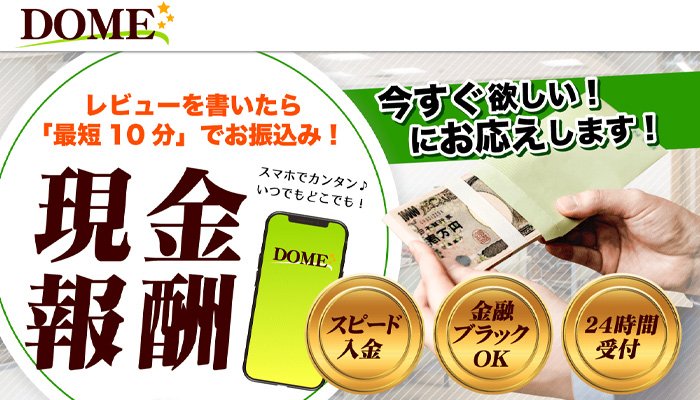 DOME(ドーム)への申し込みから最短10分、借金ではないので金融ブラックの方でも簡単に現金を受け取れます。