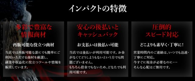 インパクトで提供しているのは、情報商材を後払い購入し、キャシュバックを受けられるサービスです。