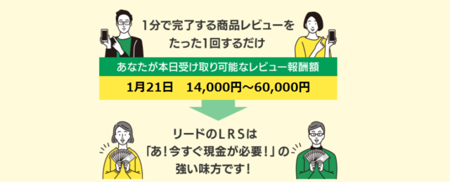 リードの特徴は、後払いで購入した商品のレビューをすることで最短30分でレビュー報酬を受け取れる、LRS(リードレビューシステム)を採用していることです。