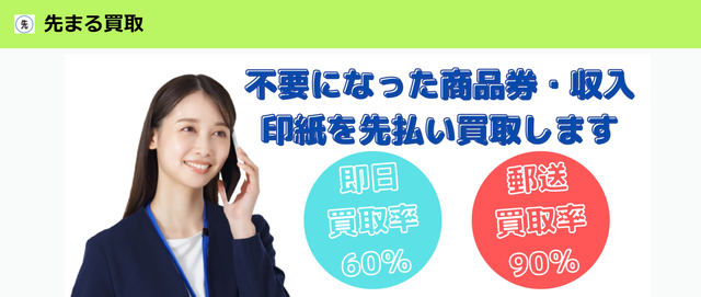 先まる買取で提供しているのは、商品券、収入印紙を買取申し込みするだけで即日現金を受け取ることが出来る先払い買取サービスです。