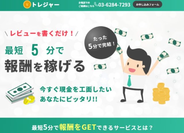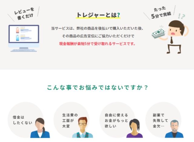 トレジャーで提供しているのは、情報商材を後払いで購入し、レビューを投稿することで現金で報酬を受け取れるサービスです。